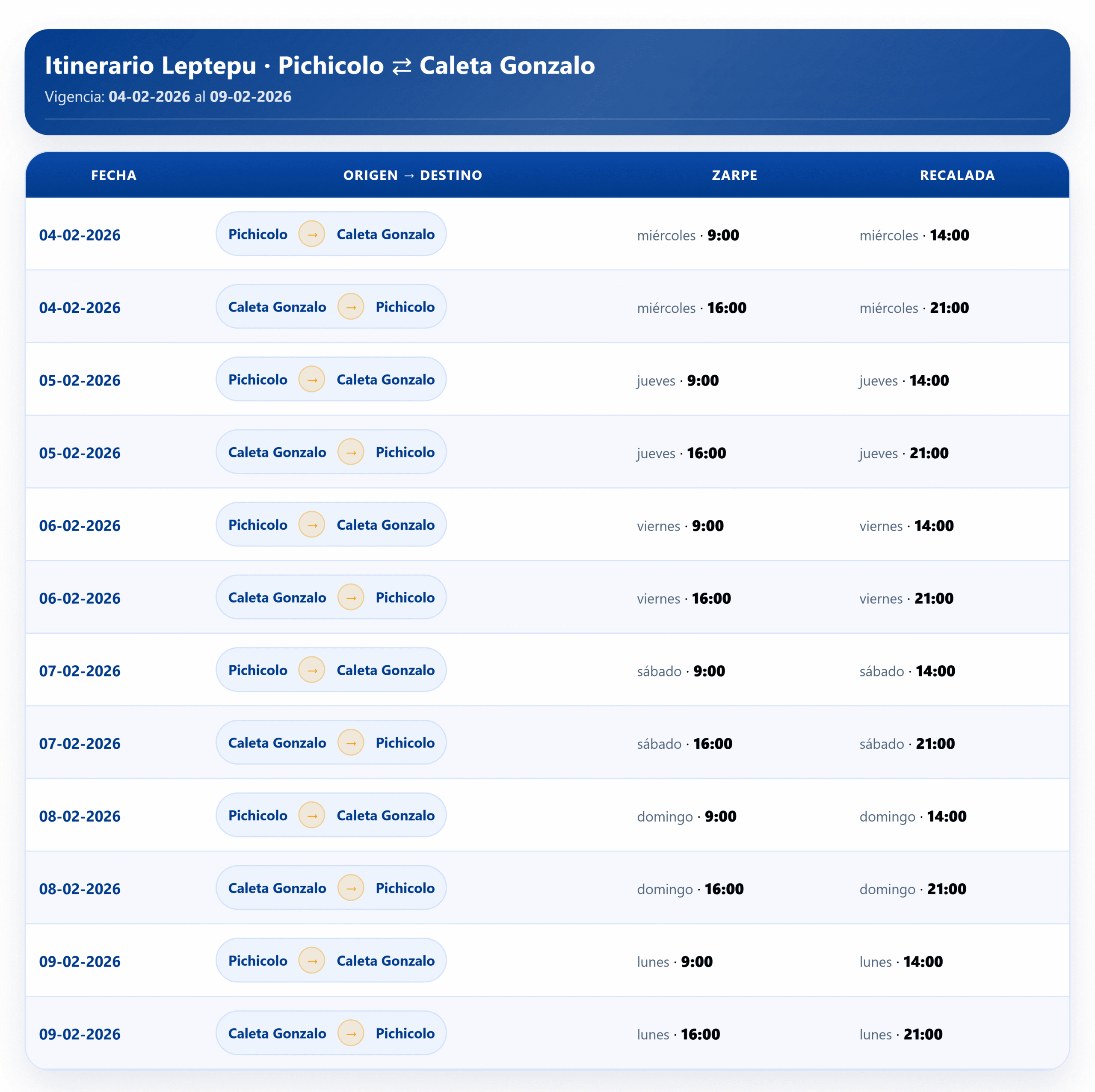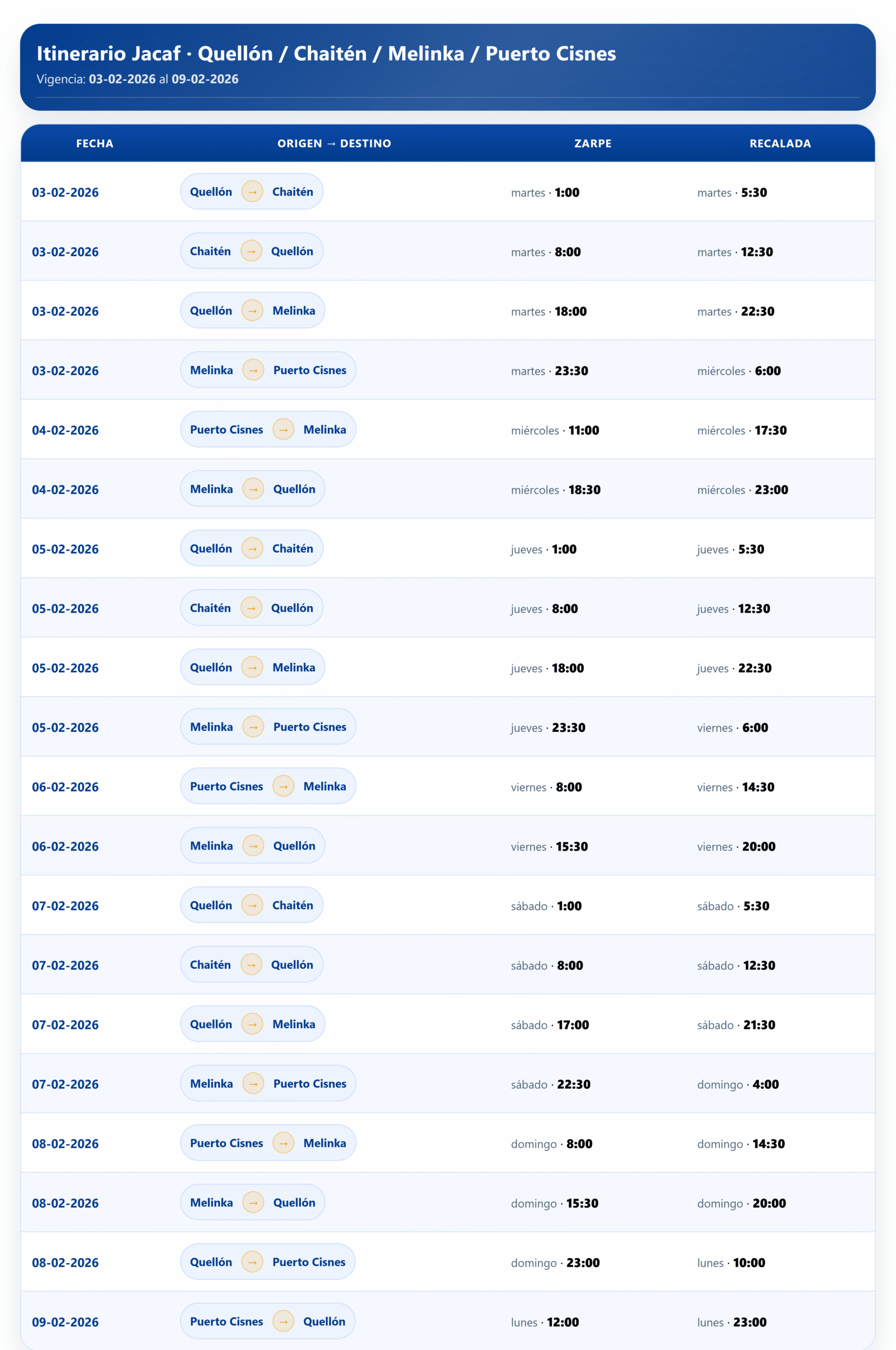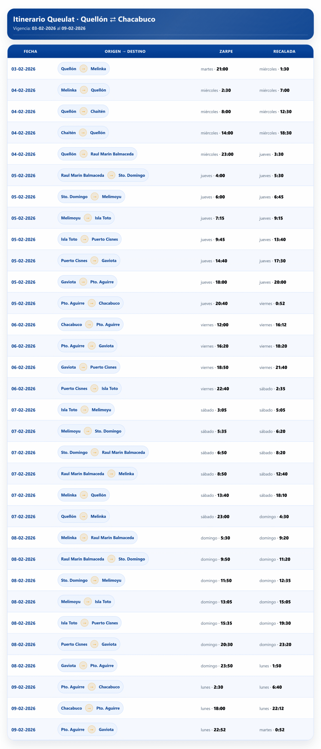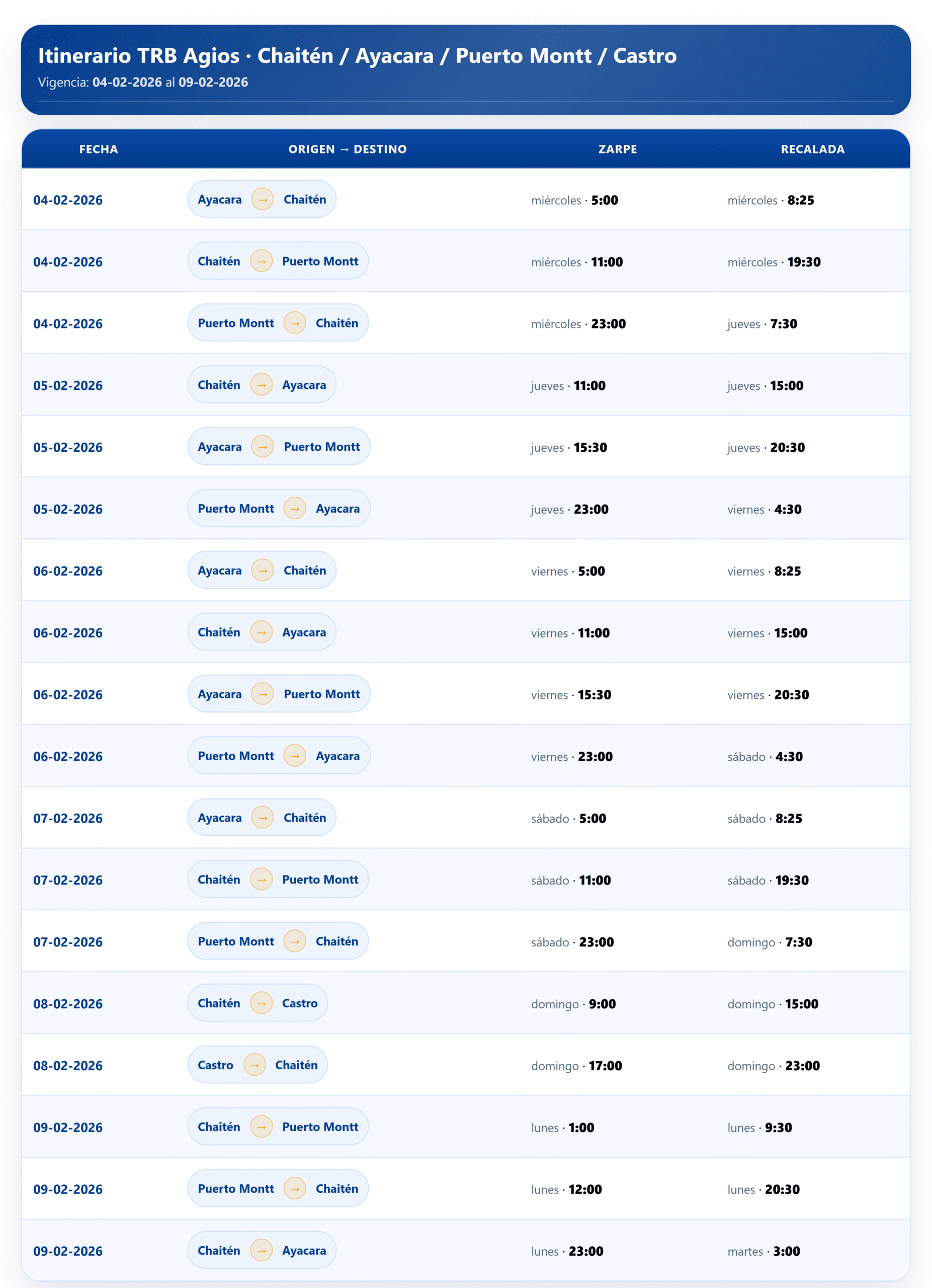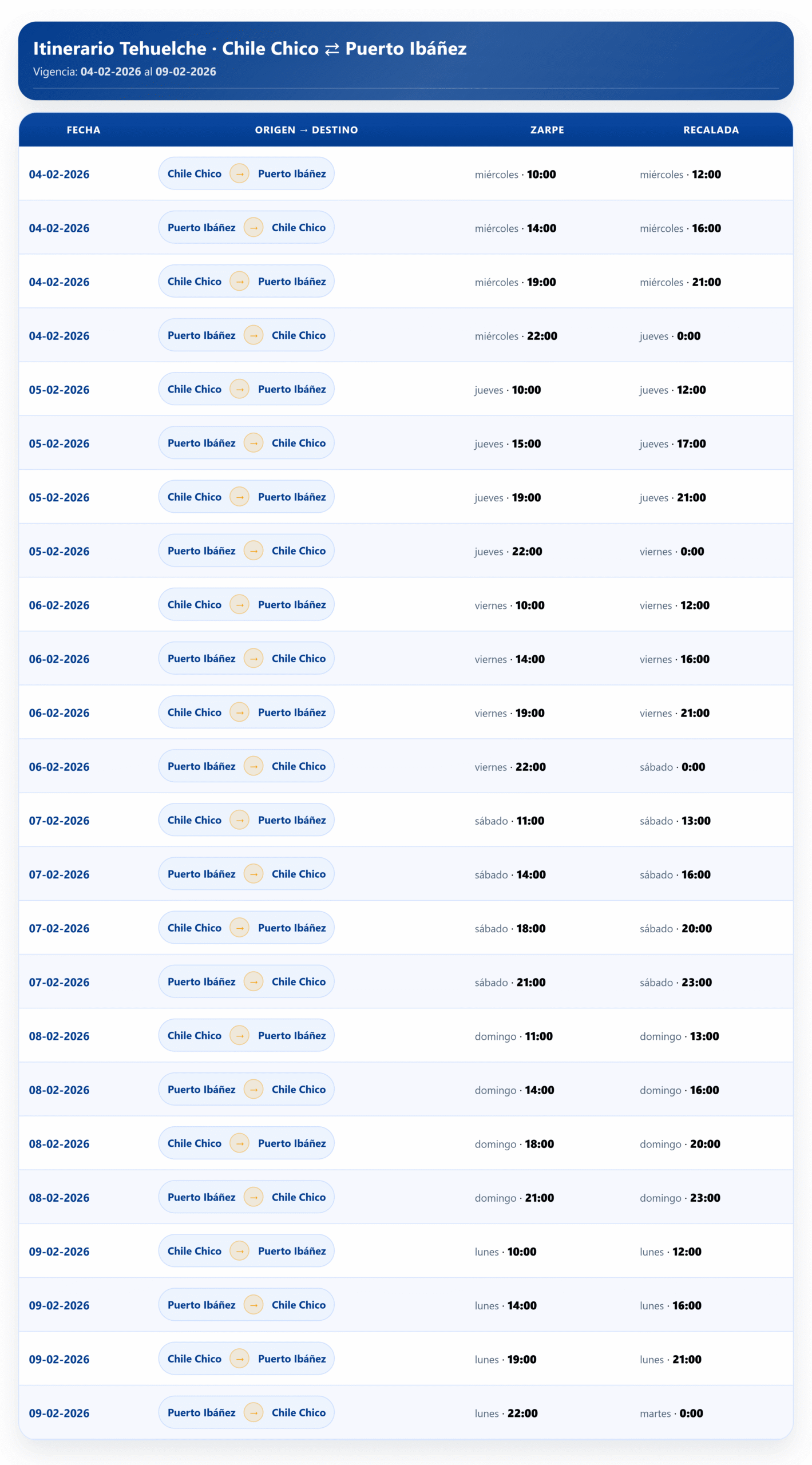 - Los pasajeros deben presentarse una hora antes del zarpe y vehículos dos horas antes del zarpe.